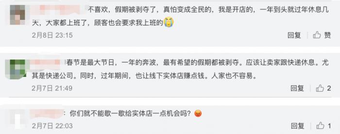 部分网友还表达了对电商平台这一做法的担忧。有开店的网友表示,希望在春节假期歇一歇,免得日后“全年无休”将会变成常态。也有认为此举会冲击线下实体店的销售情况,颇有“赶尽杀绝”的意味。