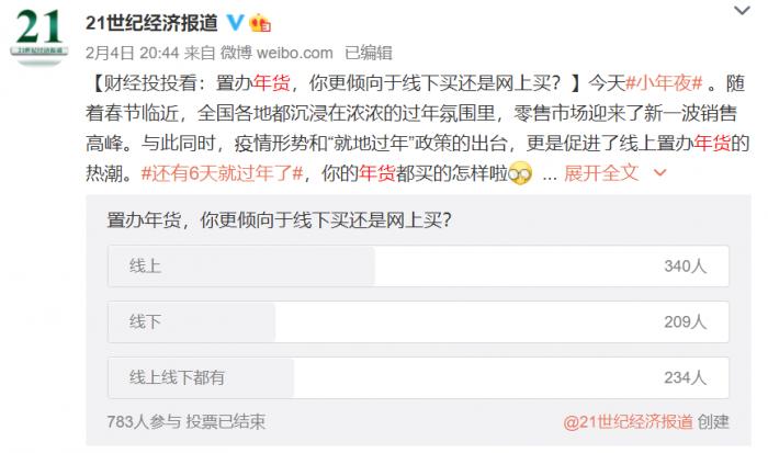 21网调君的投票显示,选择线上买年货的网友最多,占43.4%;其次是选择“线上线下都有”的网友,占比近3成;选择线下购买的网友最少,为26.7%。