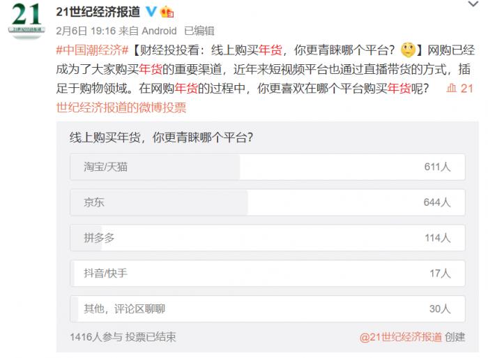 在“线上购买年货,你更青睐哪个平台?”的投票中,淘宝/天猫和京东均获得了超过4成的得票率。拼多多则获得了不到1成的投票率。抖音和快手今年也站上了年货节的舞台,但与其他电商平台相比,差距仍然较大。传统电商平台仍是90%以上网友办年货的主要渠道。