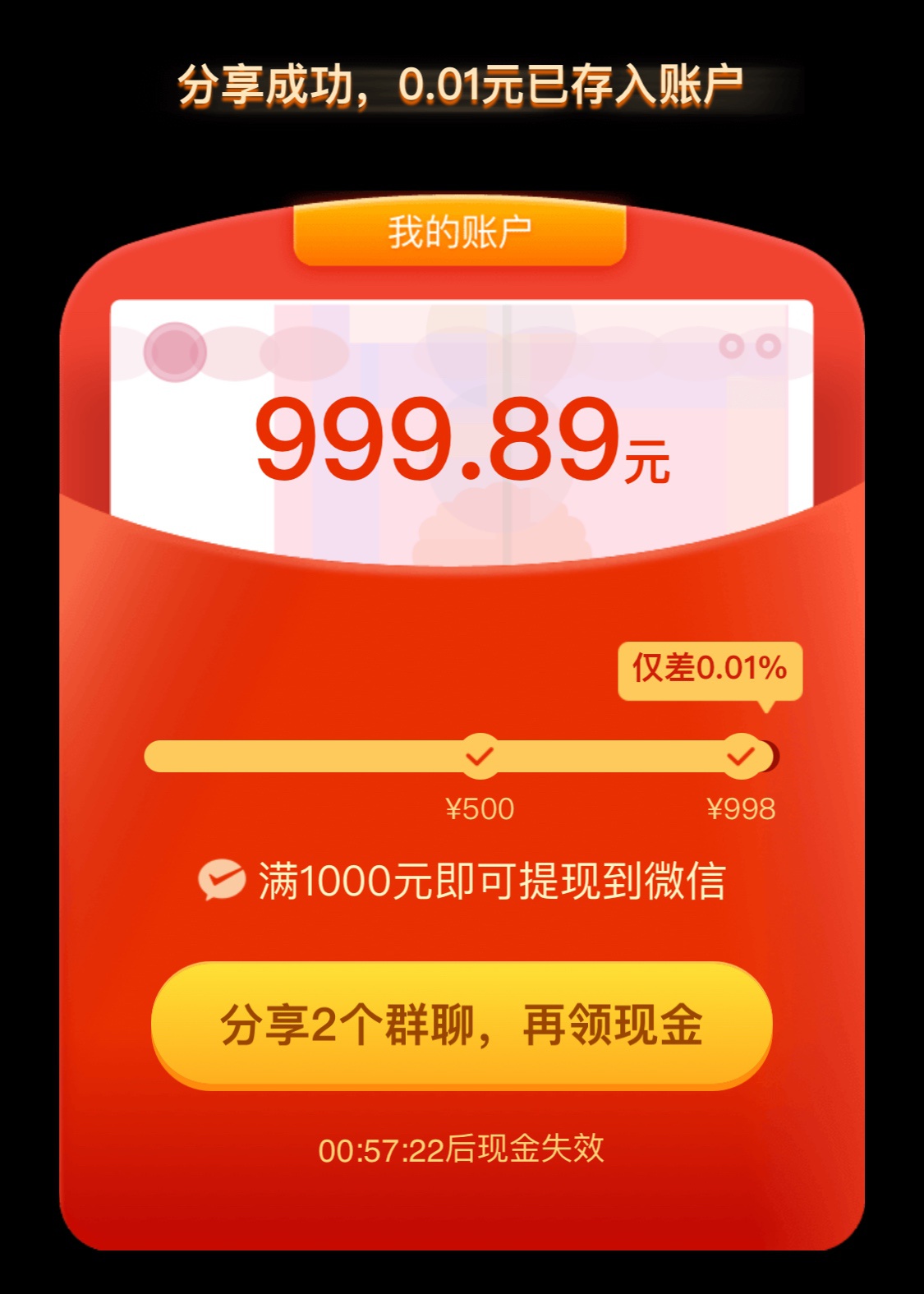 至于“邀请8个好友助力”以“抽100元微信打款”的活动,澎湃新闻记者在好不容易凑到8位好友助力后,进入了一个抽奖页面并显示抽到999.88元的超级大奖,但需要满1000元才能提现到微信。要凑到1000元,还得分享至群、邀请新好友助力……
