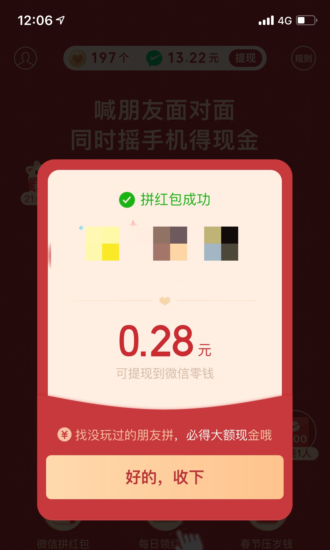 和拼多多过往的活动类似,要想获得拼多多的红包,还是得靠拉下面子找朋友助力帮忙,比如“喊朋友面对面同时摇手机”、“和微信好友拼红包”。