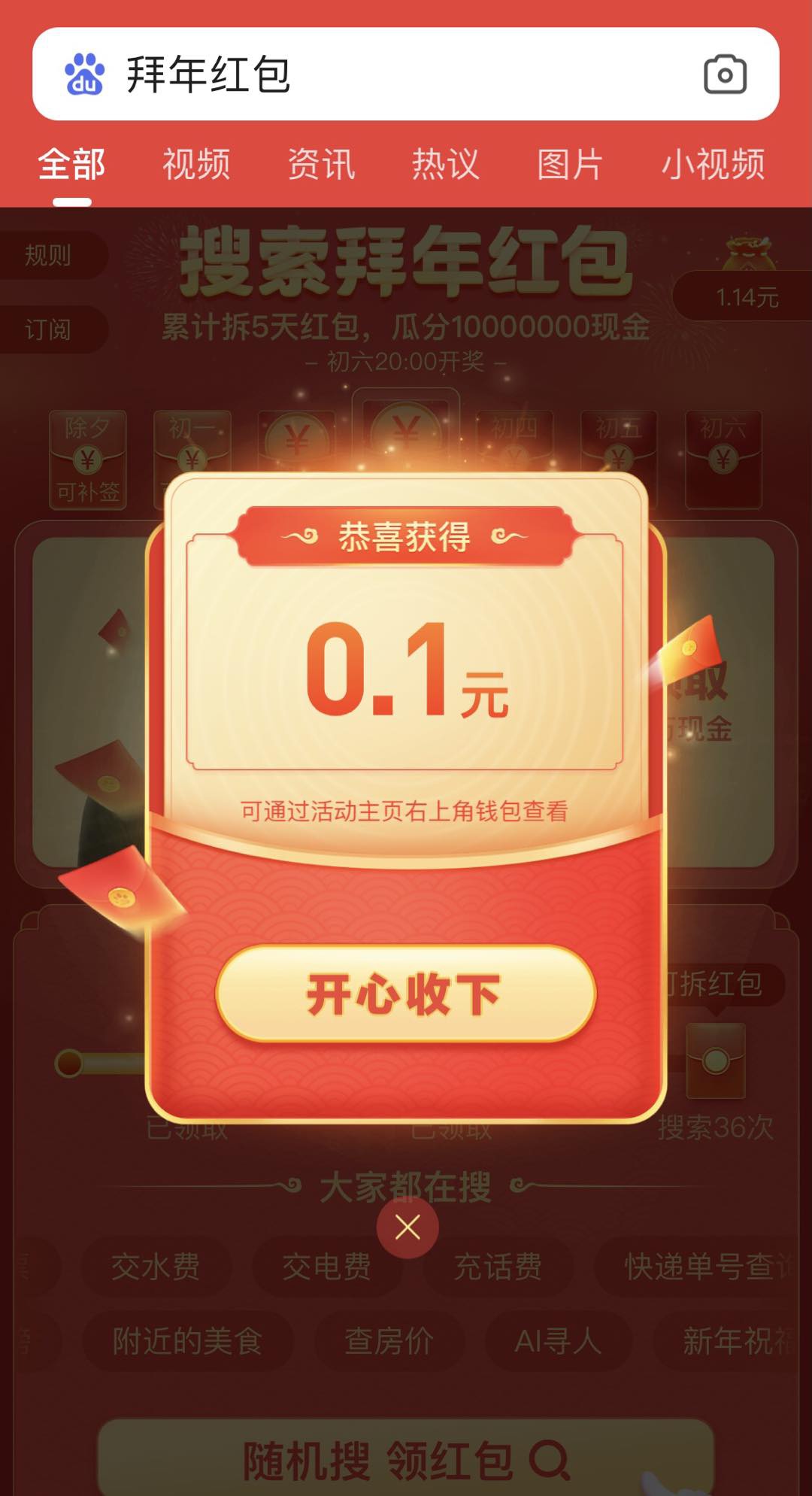 经简单计算,每天签到3毛6的红包,搜索36次解锁3个红包共计3毛,要凑到5元,得2月11日至2月17日整个春节活动期间每天都完成百度App上的相应任务,才有可能凑满。