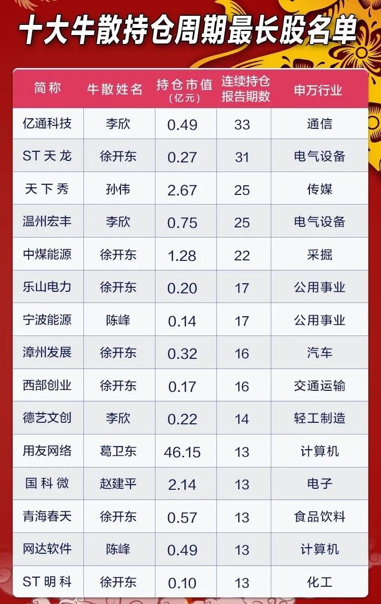 数据宝统计显示,16股获牛散持仓3年以上,持仓周期最长的是亿通科技,牛散李欣持有该股长达33个季度。李欣于2012年第三季度持仓后一直保留在前十大流通股东之列,若从2013年起算,迄今涨幅达到216%。