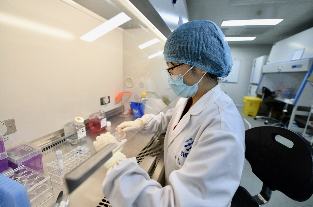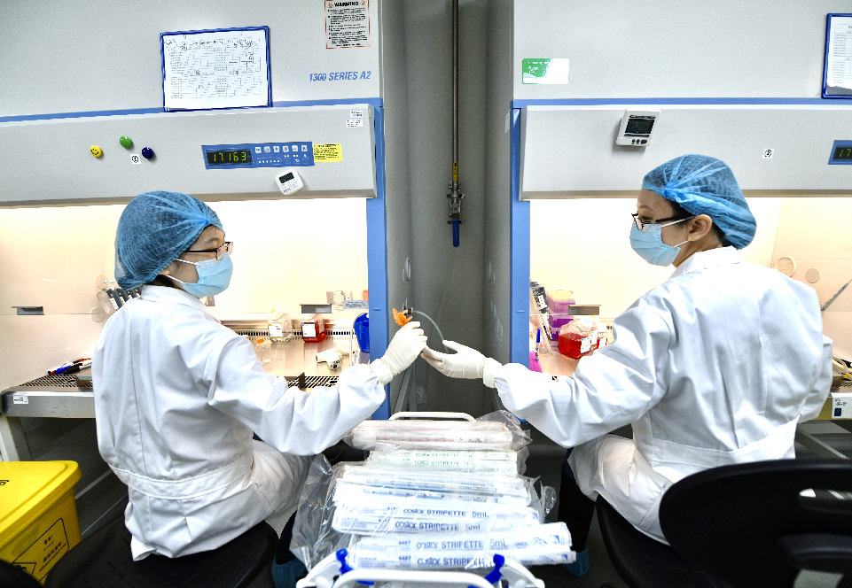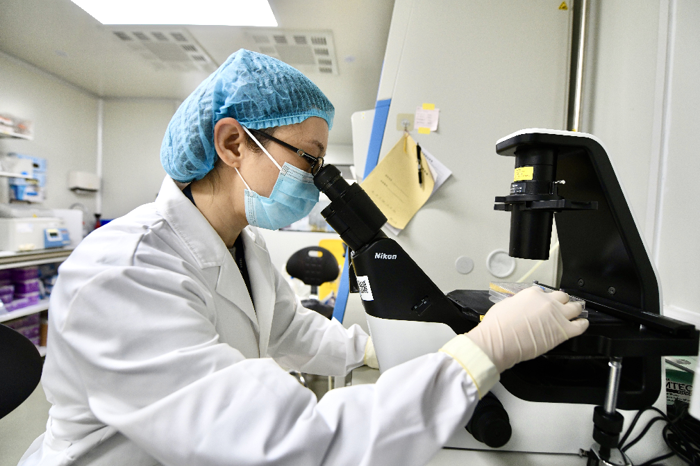 “繁育”这些细胞可是一个细致活儿,得在负压细胞间里完成。邓洪婧穿上工作服,戴上口罩、防护帽,走进细胞间。她从培养箱取出细胞培养皿,置于显微镜下,观察细胞的生长情况;再加入胰蛋白酶,让细胞从培养皿脱落、分离,悬浮在培养基里;最后离心收集细胞,用移液枪吸取部分细胞转移至新的培养基中。等所有的工作完成,一个上午的时间已经不知不觉过去。