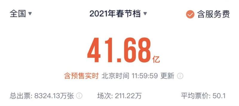 根据灯塔专业版数据,截至2月14日中午12点,牛年春节档综合票房约为41.68亿元。
