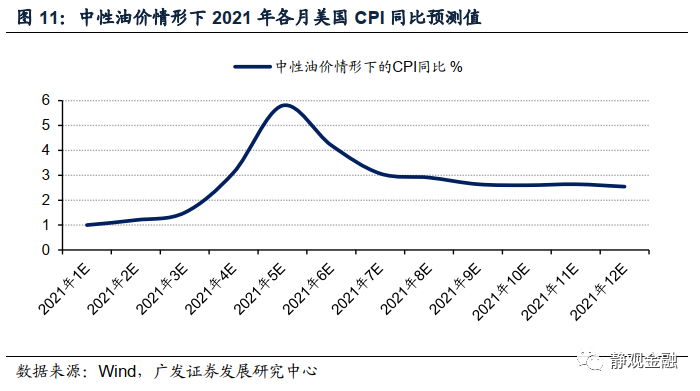 Q2美国CPI同比或迎多年高点,不排除破6%可能。我们在年度展望《警惕预期差:2021年海外宏观经济展望》中指出,2021年上半年WTI原油价格重回疫前水平为中性情形(目前已兑现),在此情形下由于原油价格的基数效应,2021年3-5月美国CPI同比增速会快速攀升并有望在5月迎来全年CPI同比高点。以目前的油价评估美国CPI同比5月破6%概率不低,一旦如此美国CPI同比将迎1991年以来最高。