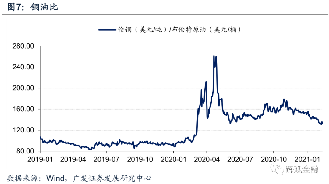 原油短期或仍有上行空间。2月12日WTI油价为59.47美元/桶,较12月末上涨22.6%。尽管油价已回到疫情前水平,但与疫前相比,金油比、铜油比仍偏高,说明油价金融属性权重仍不高。只要美国第三轮财政刺激加紧推进,海外市场保持Risk-on状态,在沙特仍增加减产的背景下短期原油价格或仍有一定上行空间。