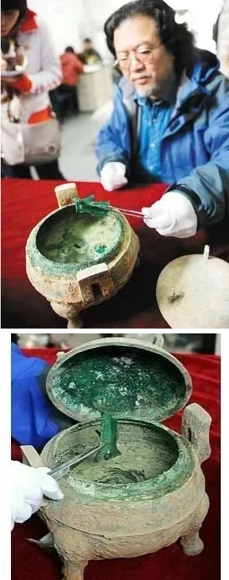 陕西省考古研究院工作人员将铜鼎和铜锺打开时,惊奇地发现,鼎内有保存完好的骨头汤,锺内有酒,其中骨头汤为我国首次发现。