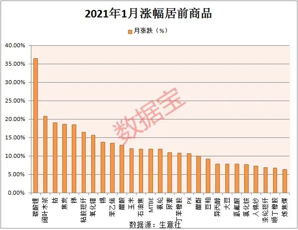 据生意社价格监测,2021年1月沪深原材料价格涨跌榜中,环比上升的商品共70种,其中29类商品集中在化工板块,9类商品集中在纺织板块,而涨幅超5%的商品主要集中在化工板块,涨幅前三的商品分别为碳酸锂、阔叶木浆和钴。