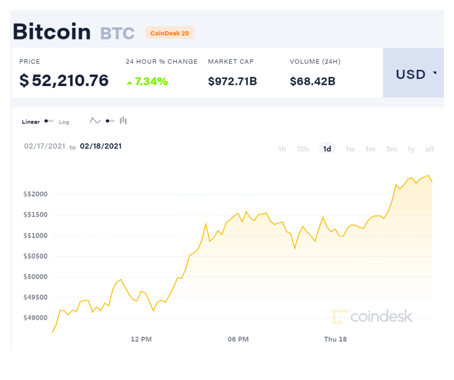 在隔夜重回50000美元上方之后,比特币价格涨势延续,最高站上5.26万美元,较日内低位涨超3000美元。截至目前,比特币报52210.76美元,24小时涨幅超过7%。