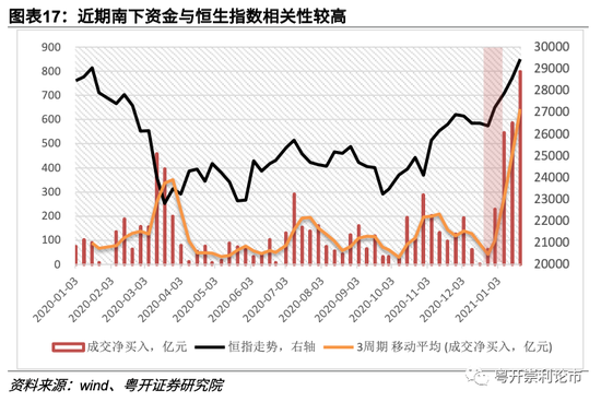 整体来看,本地持股机构和外资持股机构在不发生黑天鹅的情况下,整体持股水平较为稳定,而当下港股市场的边际力量为南下资金的持续流入,也是推动近期指数走强的重要原因,虽然南下持股市值只占到港股整体的3%不到,相较于外资仍显得薄弱,但是从市场表现来看,近1年以来,南下净买入MA3和恒生指数相关性较高,港股在经历了去年年初的外资出逃后,南下资金正在成为港股市场的“新秀”,成为改善港股市场的一股边际力量。