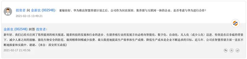 对于华为的“入圈”,金新农(维权)日前也在互动平台表态称,随着科技的发展和行业的进步,生猪养殖行业的发展方向必将向智能化、数字化、自动化、无人化(或少人化)迈进,特别是在后非瘟的背景下,减少人畜之间的接触,强化生物安全的防范,做到精准饲喂减少浪费,最大限度地提高生产效率和生产成绩,降低生产成本是企业不断追求的目标。近几年,公司在智慧养猪方面一直在不断地探索和实践中。