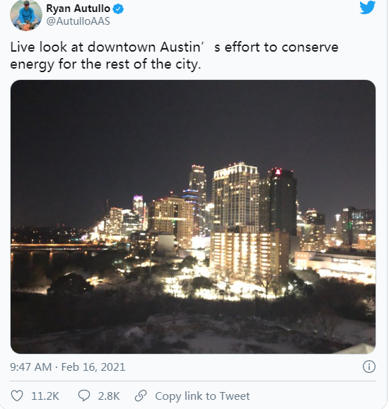 这是几张在推特上广为流传得州首府奥斯汀市的图片,市中心明亮炫目,灯火不熄。停电,似乎根本不存在。