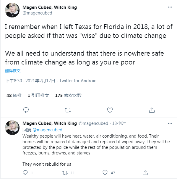 有钱人会有暖气、水、空调和食物,他们的家园如果损坏将得到修复,如果被摧毁将得到更换,他们将受到警察的保护,而他们周围的其他人则被冻僵、烧伤、淹死或挨饿,他们不会为我们重建家园。”