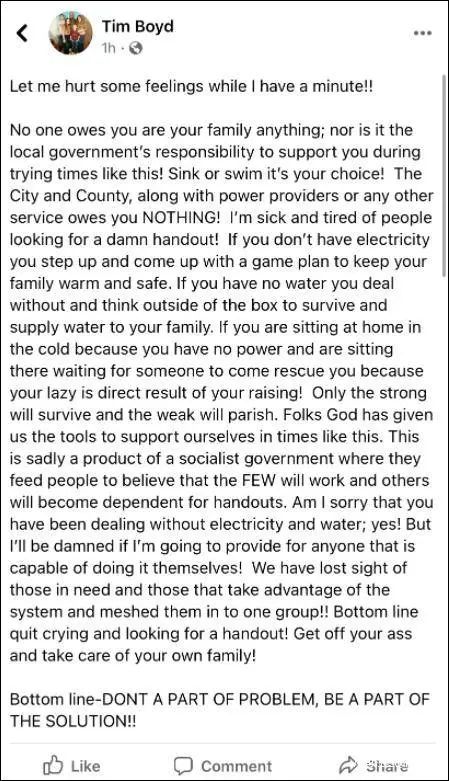 他在一个网贴中写道:“政府的责任不是在这种困难的时候给你们提供帮助!生存还是死亡是你们自己的选择!政府和电力供应商以及其他服务供应商并不欠你们什么。”
