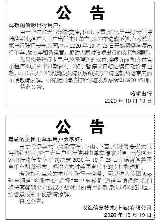 2020年10月,哈尔滨宣布,考虑到降雪季即将到来,天冷路滑,共享单车25日前全部入库“冬眠”,次年春季再恢复正常使用。随后,各大共享单车运营商不得不响应政策,发布了暂停运营的公告。看来冬季里的哈尔滨街道,注定与两大新兴出行工具无缘。