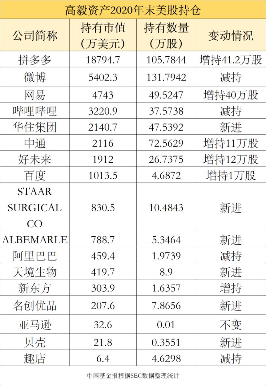 数据显示,高毅资产四季度增持41.2万股拼多多至105.8万股,持有市值近1.9亿美元,为第一大重仓股,占高毅在美仓位的44%。