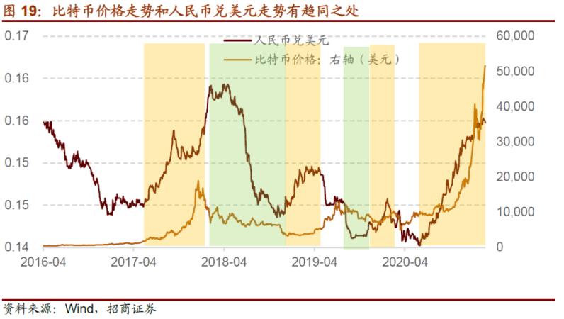 ⚑ A股与比特币:类似比特币,人民币资产能一定程度对冲G7货币超发,A50指数期货与比特币相关性高。但比特币是较为纯粹的反映流动性的品种,其价格变化对A50具有一定的领先效果,2017年以来比特币多次提前预测了A50指数的大跌。
