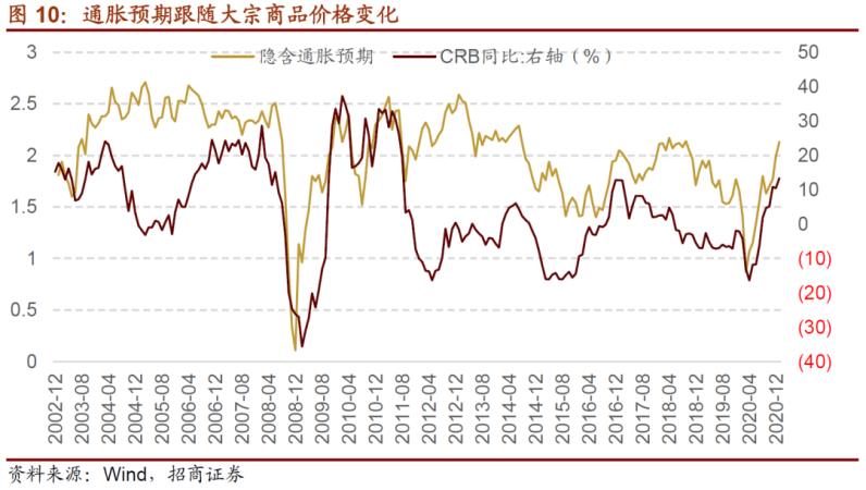 一般而言通胀预期跟随大宗商品趋势,大宗商品中,原油、铜对于通胀预期贡献较大。