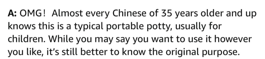 “天哪!几乎每个35岁以上的中国人都知道,这是一个典型的便携便盆,通常是给小孩子用的。既然你说愿意怎么用怎么用,你还是知道它的原始用途为好。”