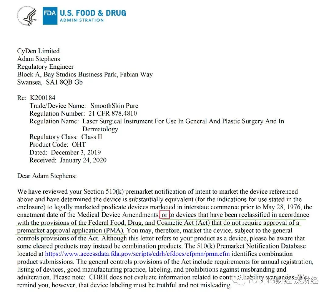 某检测机构的工作人员向YOUNG财经表示,美容仪产品在FDA方面的审批、认证流程是:FDA对美容产品适应症部分的通过,属于“自我宣告”为主,是“宣告”,而非“认证”——“自证有效、后期追责”,即只要品牌方提交证实自己有效果,接受市场监督并每年更新即可。