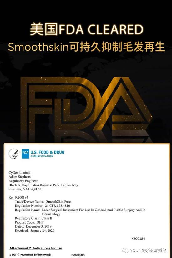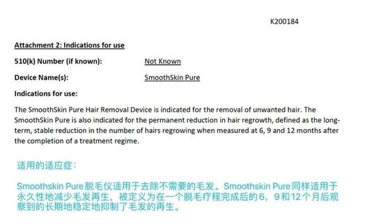 “我们在此附了510(k)证书的截图和翻译。510(k)证书中的产品适应症需要经过FDA审批,不是随心所欲地写的。Smoothskin品牌设有专业的临床实验室,对产品安全性和有效性有临床试验报告。”