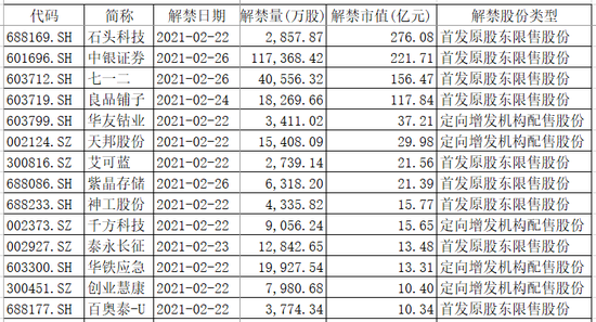 Wind数据显示,本周面临限售股解禁的股票中,按最新收盘价计算,有4只股票解禁市值超过100亿元,分别为石头科技、中银证券、七一二、良品铺子,解禁市值分别为276.08亿元、221.71亿元、156.47亿元、117.84亿元,且解禁的均为首发原股东限售股份。而从个股的解禁量来看,中银证券(11.74亿股)、七一二(4.06亿股)、华铁应急(1.99亿股)、良品铺子(1.83亿股)位居前四。