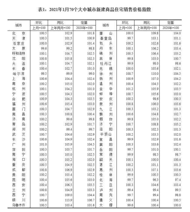 2021年1月70个大中城市新建商品住宅销售价格指数。截图自国家统计局官网