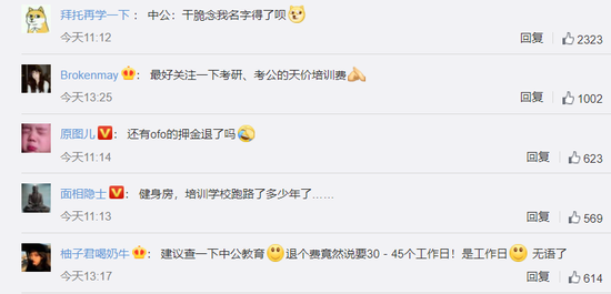对此,有网友评论称,”建议查一下中公教育,退个费竟然说要30-45个工作日!“。还有网友打趣,”中公:干脆念我名字得了呗“。