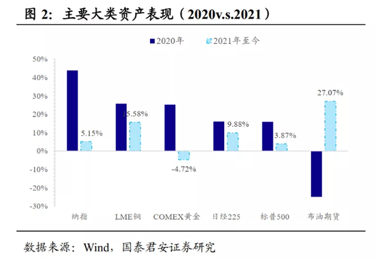 但需要关注的风险是,输入性通胀压力有多大?如果叠加了需求一端,只要供给不出现超前大幅扩张,参考历史几轮商品上行周期,相对保守估计下油价至少有翻倍行情,即从低点35美元/桶左右涨至70美元/桶。对应当前来看,油价上涨还未结束。在这一情形下,货币政策进一步收紧的拐点可能会到来,至少在市场预期层面会兑现。