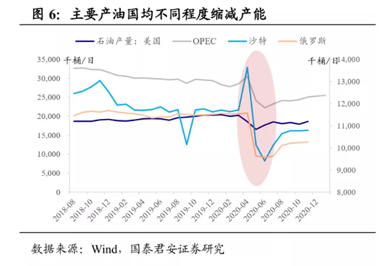 2020Q4至今的两轮油价上涨,供给收缩起到很大助推作用。2020.11~2020.12,市场对疫苗产能存在质疑,部分经济体再度封锁,均加剧了供给的不确定性。原油从35美元/桶涨至50美元/桶。2021.01至当前,沙特意外主动减产+美国寒潮被动减产,油价快速突破60美元/桶。