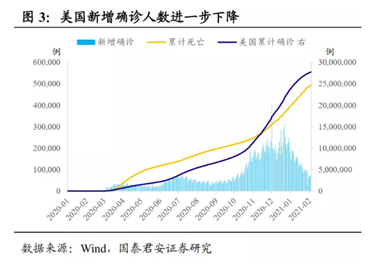 此前疫情反复压制市场对经济复苏的预期。但事实来看,B117型变异毒株并未引起新一轮疫情大规模扩散,美国新增确诊人数进一步下降。目前发达经济体疫苗接种率平均达到了15%,并且速度可能进一步加快。以英国为例,2月中旬接种率达到30%,根据首相鲍里斯的说法,预计7月底前完成对所有50岁以上公民的接种。