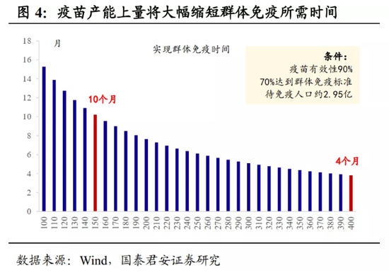 此外,根据彭博预测,到6月份疫苗产能将从1000万剂/周扩大3倍至3000万剂/周。根据美国总人口、已确诊、累计接种等已知条件测算待免疫人口约为2.95亿人(根据WHO,70%即达到群体免疫水平),假设疫苗有效率90%,那么疫苗产能大增意味着美国实现群体免疫时间将缩短60%至4个月左右。