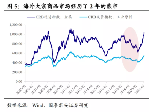 ②对比国内和海外分别定价的大宗商品,2016~2017年国内供给侧改革阶段,螺纹钢累计涨幅达到157%,高于原油的65%,高于铜价的42%;而2020Q4以来,原油涨幅74%,远高于铜价35%,高于螺纹钢的20%。在国内地产和基建需求难以大幅改善、国内供给侧改革持续时间较久的背景下,导致国内定价大宗商品价格弹性远远弱于海外定价大宗品。