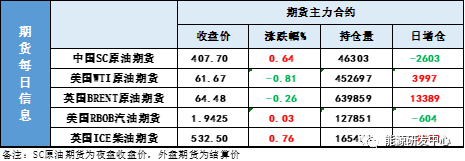 【1】WTI主力原油期货收跌0.5美元,跌幅0.81%,报61.67美元/桶;布伦特主力原油期货收跌0.17美元,跌幅0.26%,报64.48美元/桶;INE原油期货收涨0.64%,报407.7元。