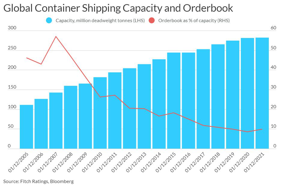 更成熟的产能管理有助于避免大流行期间的供过于求。在经历了十多年的产能过剩压力之后,该行业通过并购和联盟进行了彻底的合并。当大流行开始时需求下降时,航运联盟实现了战略性运力下降,并在20年下半年交易反弹时有效地重新激活了船队。三个最大的联盟服务于美中航线的约85%,而七年前约为60%,几乎涵盖所有东亚-欧洲航线。集装箱订单占现有船队的比例目前处于10%以下的最低水平– 2007年为57%。