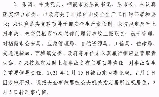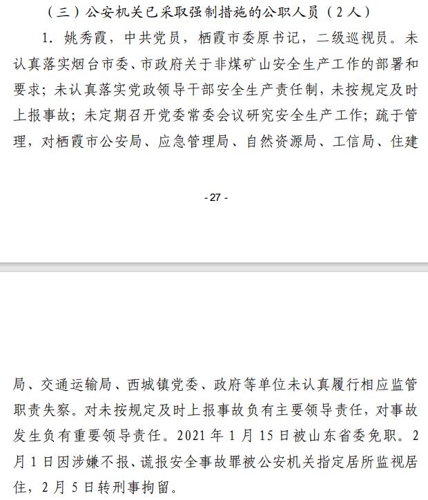 2月23日,山东省应急管理厅发布了该起事故调查报告,共50页、3万余字。栖霞市原市委书记姚秀霞、栖霞市原市长朱涛的处理结果一并公布。