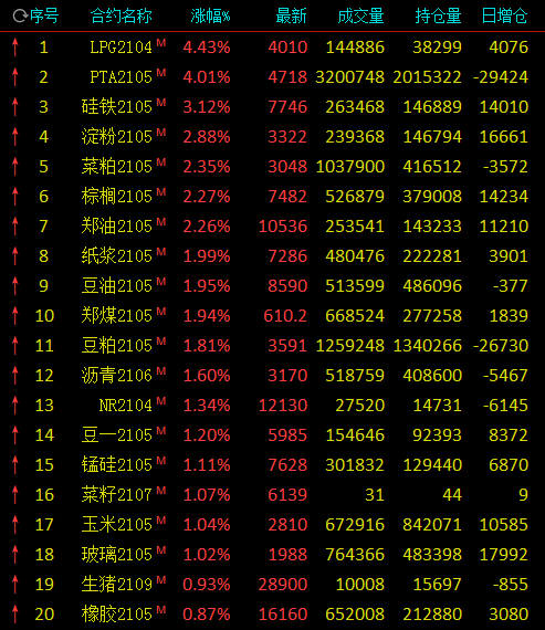 热点栏目2月24日,国内商品期货收盘涨跌互现,能化品多数上涨,LPG、PTA涨逾4%,动力煤、沥青涨近2%;油脂油料上涨,棕榈油、菜油、菜粕涨逾2%;农副产品中,苹果跌逾3%,淀粉涨近3%;有色金属多数下跌,沪锌、沪镍跌逾2%。