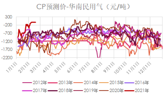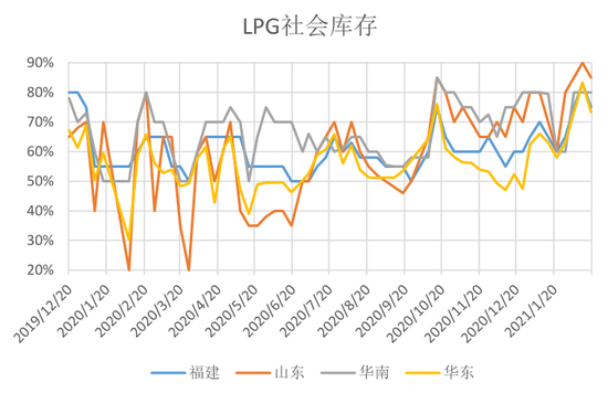 民用气需求向好:“就地过年”推动全国重点零售餐饮企业销售额强势增长,较去年春节同期增长28.7%,较疫情前19年同比增长4.9%,餐饮消费需求回暖推动终端补库需求,根据金联创抽样库存数据显示,截止2021年2月19日,全国社会库存较上周环比下降5%,各地区均有下行,全国码头库存总量约为119.26万吨,较上期减少1.71%,因本周正处于春季假期交通运力下降,炼厂库存小幅上升。