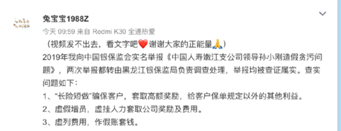 2月24日,黑龙江女员工张乃丹(微博@兔宝宝1988z)实名举报“中国人寿嫩江支公司领导孙某刚造假贪污问题”登上热搜。
