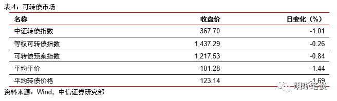 2月24日转债市场,中证转债指数收于367.70点,日下跌1.01%,等权可转债指数收于1,437.29点,日下跌0.26%,可转债预案指数收于1,217.53点,日下跌0.84%;平均平价为101.28元,日下跌1.44%,平均转债价格为123.14元,日下跌1.69%。344支上市交易可转债(辉丰转债除外),除旺能转债和兄弟转债横盘外,87支上涨,255支下跌。其中盛路转债(7.76%)、通光转债(6.41%)和亚泰转债(4.02%)领涨,奇精转债(-11.18%)、赣锋转债(-10.36%)和金禾转债(-8.65%)领跌。338支可转债正股(*ST辉丰除外),除永安行、精达股份、花王股份、滨化股份、奥瑞金、台华新材、中化岩土、新时达、吉视传媒和厦门国贸横盘外,166支上涨,162支下跌。其中天创时尚(10.02%)、小康股份(10.00%)和嘉澳环保(9.99%)领涨,太阳纸业(-10.01%)、赣锋锂业(-9.99%)和金能科技(-8.48%)领跌。
