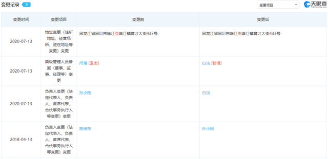 孙小刚于2018年4月进入中国人寿嫩江支公司任负责人,2020年7月退出,同步退出的还有闫嵬,统一变更为白洁。