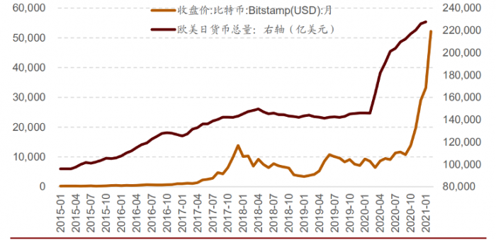 当美联储启动量化宽松、增发货币,刺激经济的同时也使美元贬值。人们需要能保值的资产,来对冲货币超发带来的风险。过去人们选择黄金,而现在比特币成为一种新的选择。