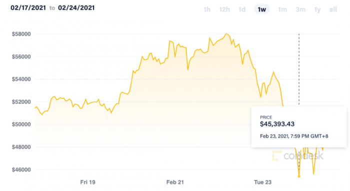 但暴跌还是来了。有人将此归咎于周一美国财长耶伦(Janet Yellen)对比特币的质疑。但这样归因似乎很难服众。毕竟比特币就是在一片警告声中涨到了历史高点。周一当天,一枚比特币的价格,和一公斤黄金差不多(58113 美元)。