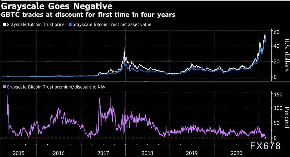规模320亿美元的GrayscaleBitcoinTrust本周已暴跌20%,超过全球最大加密货币比特币13%的跌幅。GBTC相对于标的资产曾经的大幅溢价已消失无踪,周三收盘价格较标的资产低0.7%--根据彭博汇总的数据,这是自2017年3月以来首次出现折价。