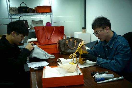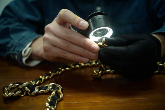 对于一名中古鉴定师来说,对真伪进行把关永远是最关键的。记者获悉,丁李钊所在的部门由4名持证执业的鉴定师以及2名学徒组成,每一件来到鉴定部的皮具、首饰等都需要经手2至3名鉴定师方能过关,除了包包本身,鉴定师还需要对原配件进行一一核验,五金、肩带、防尘袋、拉链头、镭射标,甚至铆钉、螺丝、锁和钥匙等等都需要逐一检查过来。