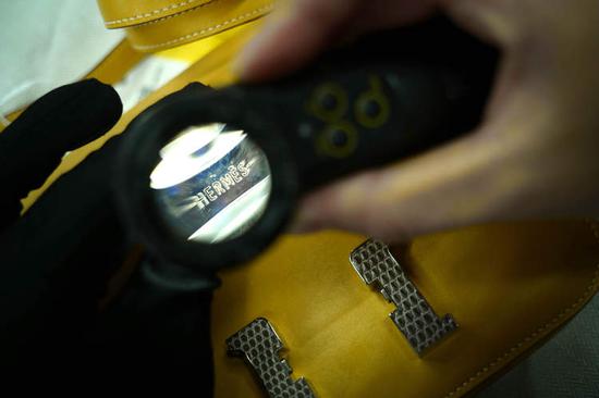 一只黄色的爱马仕单肩手袋,先从背带处入手,仔细观察油边的间距和平整度;包扣上的微型刻字得用上放大镜凑近了甄别;