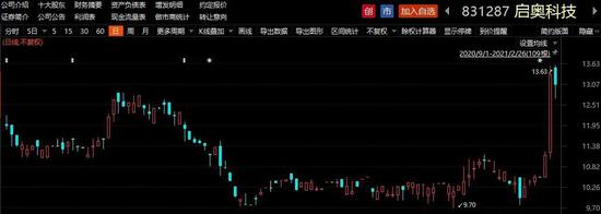 启奥科技、珠海港昇、圣兆药物、中建信息等分别宣布了精选层计划,其中多家公司正处于辅导期,而麟龙股份一度加入精选层受理队伍中,华韩整形撤回精选层申请后,获天风证券加入做市报价。骑士乳业、英派瑞等公司则已启动上市辅导,目前处于上市辅导阶段。在新增做市商后,多只精选层概念股出现大涨,启奥科技近期股价创出2020年9月以来新高。