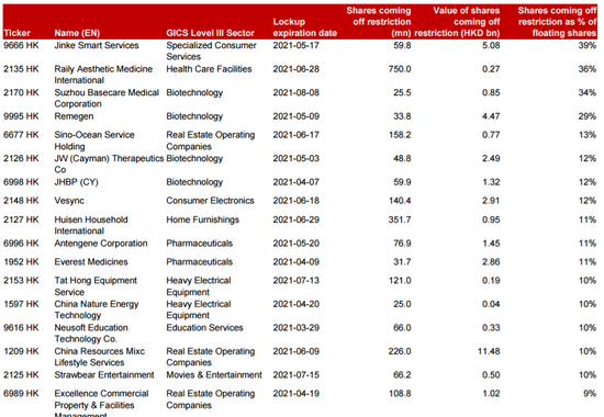 华兴资本发布《注意新上市公司解禁潮对港股和中概股的影响》的研究报告。文章指出,根据从彭博和万得下载整理的数据,按当前价格估算,发现在未来的6个月中,港股市场和在美上市中概股将分别迎来2040亿港元和655亿美元规模的解禁潮,有可能给个股股价表现带来压力。