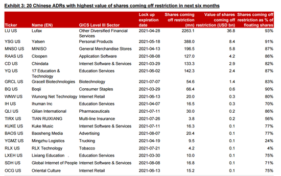 华兴在报告中列出70支在未来六个月内解禁规模较大的港股与在美上市中概股,主要公司一览: